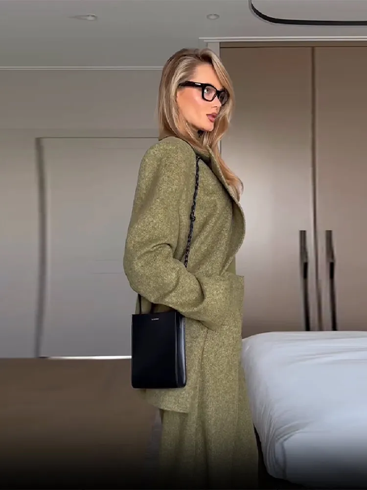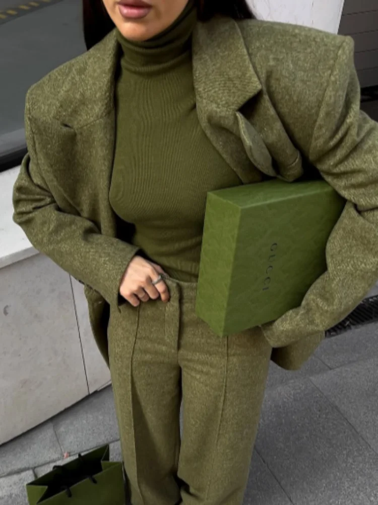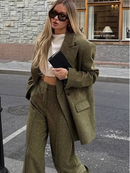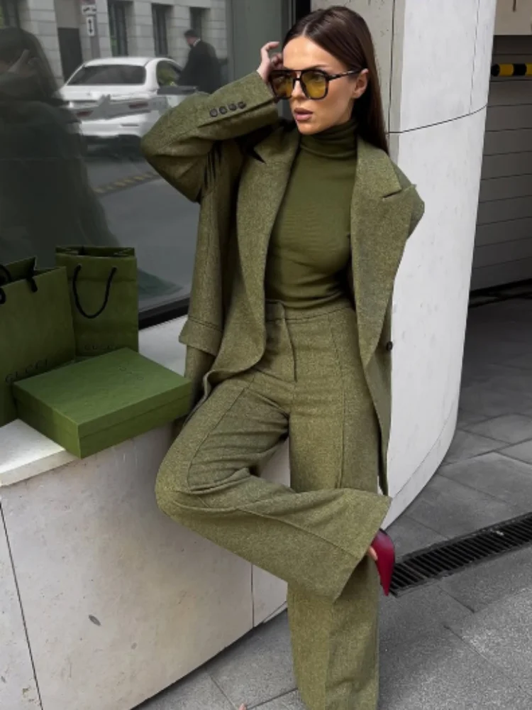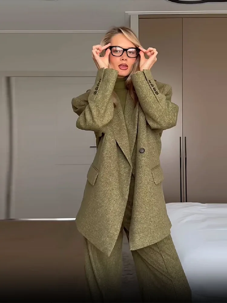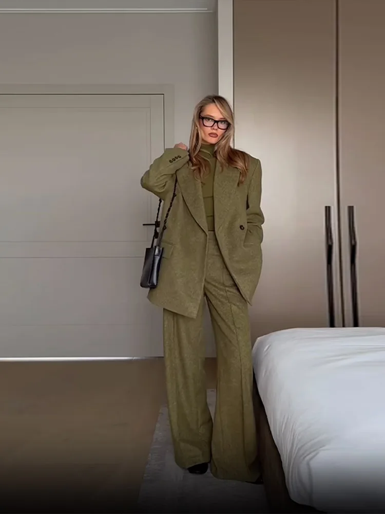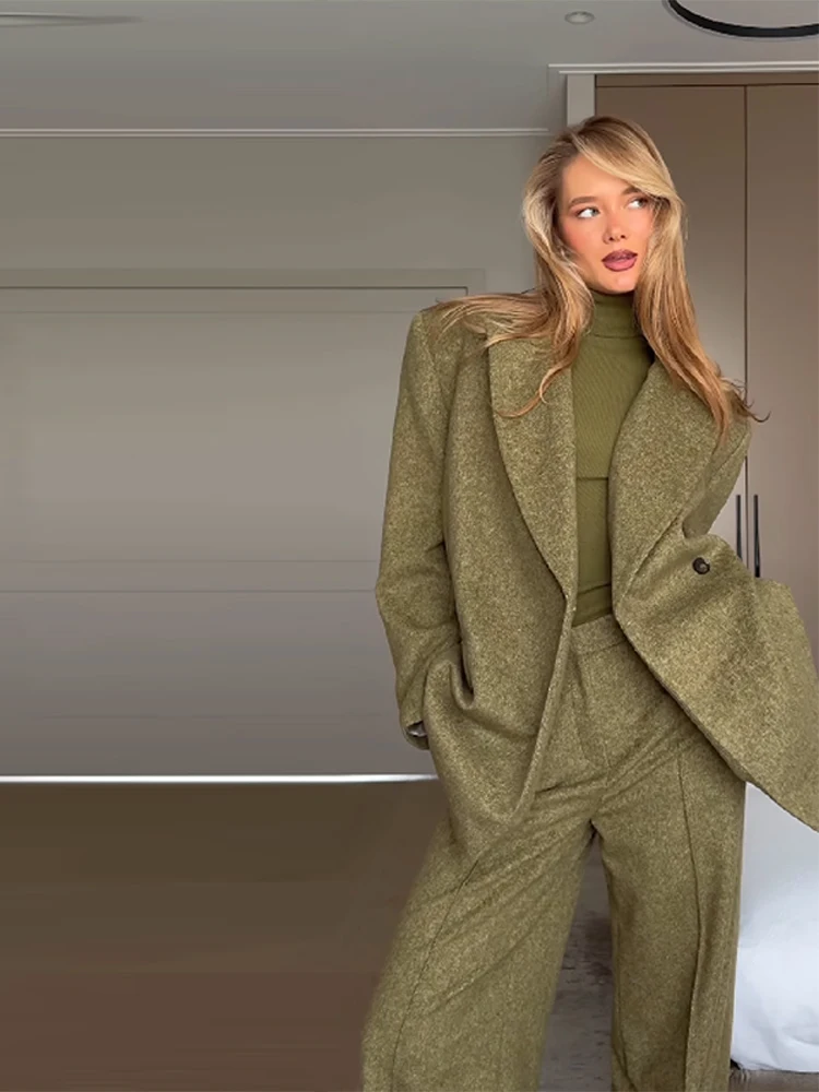 Women's Elegant Woolen Suit Sets Padded Shoulder Loose Suit Coat High Waist Big Leg Suit Pant 2025 New Lady Autumn Winter Outfit