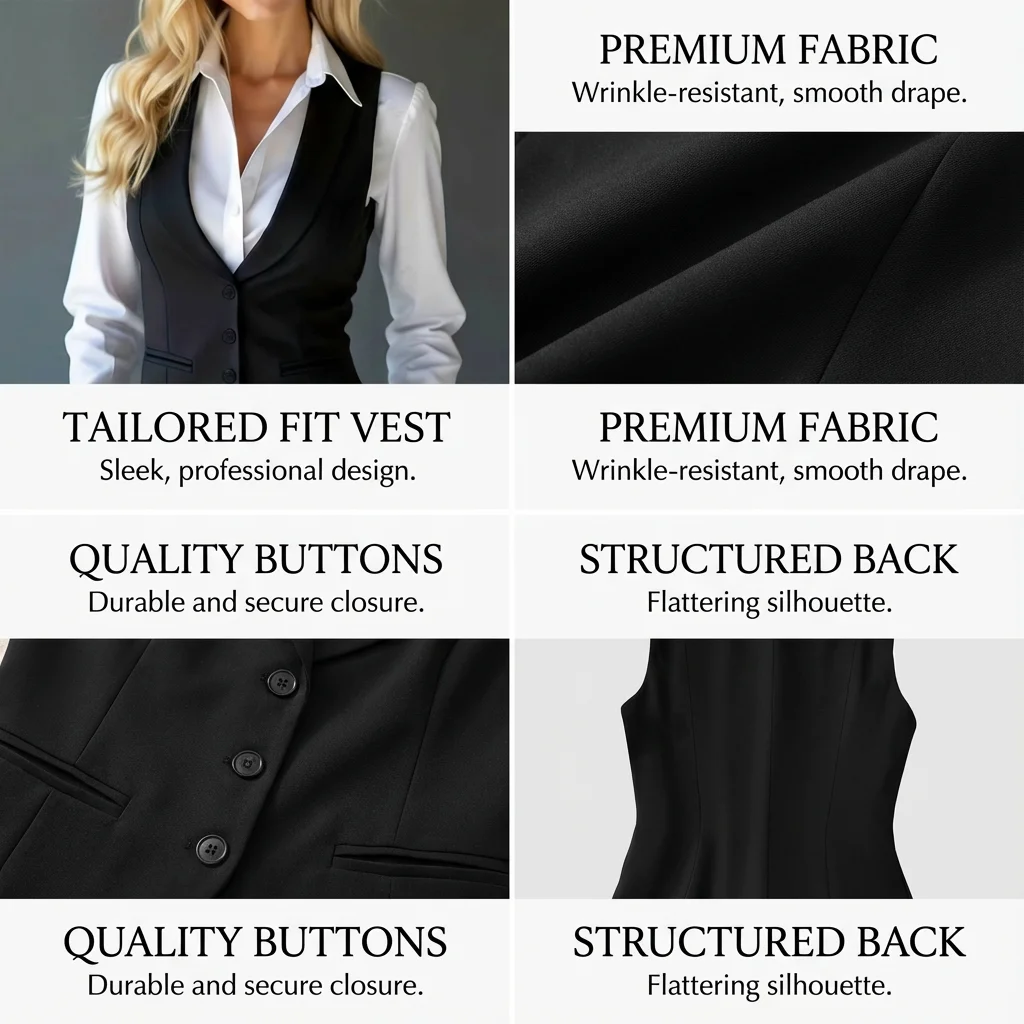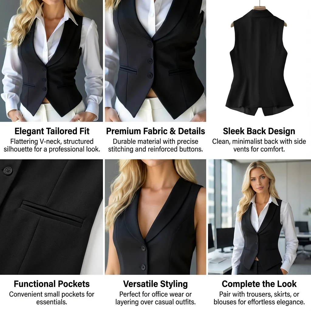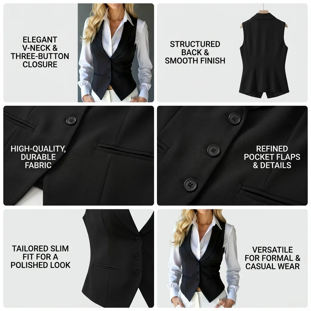 Crafted from a high-density, wrinkle-resistant suiting fabric, it drapes beautifully and maintains its crisp structure throughout the day. Whether layered over a classic button-down for the office or worn as a chic standalone top, this black vest is the versatile cornerstone your closet has been waiting for.